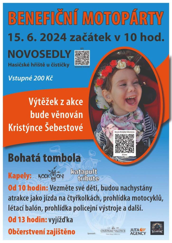 Připojte se k nám na nezapomenutelnou Benefiční motopárty pro Kristýnku, která se uskuteční 15.6.2024 od 10:00 v Novosedlech ( Hasičské hřiště u čističky ). Celý výtěžek akce půjde přímo na podporu Kristýnky a její rodiny v jejich boji. Nejenže zažijete den plný zábavy, ale zároveň uděláte něco skutečně dobrého.