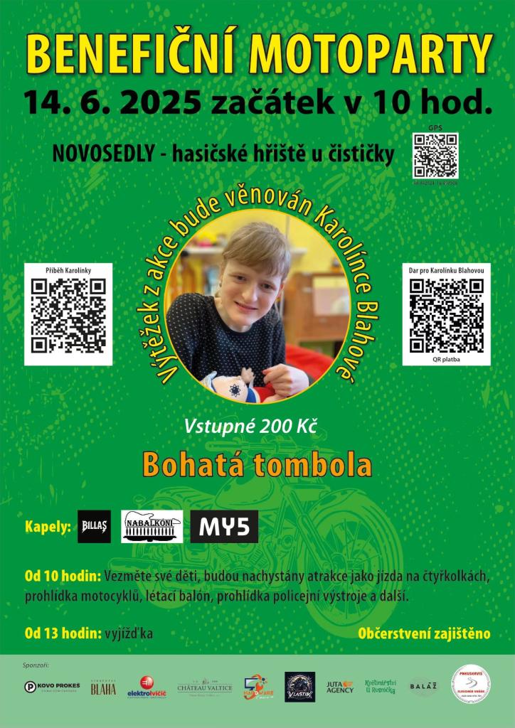 Už 14. června 2025 se na Vás těšíme na Benefiční motopárty pro naši Karolínku, a to od 10:00 v Novosedlech.